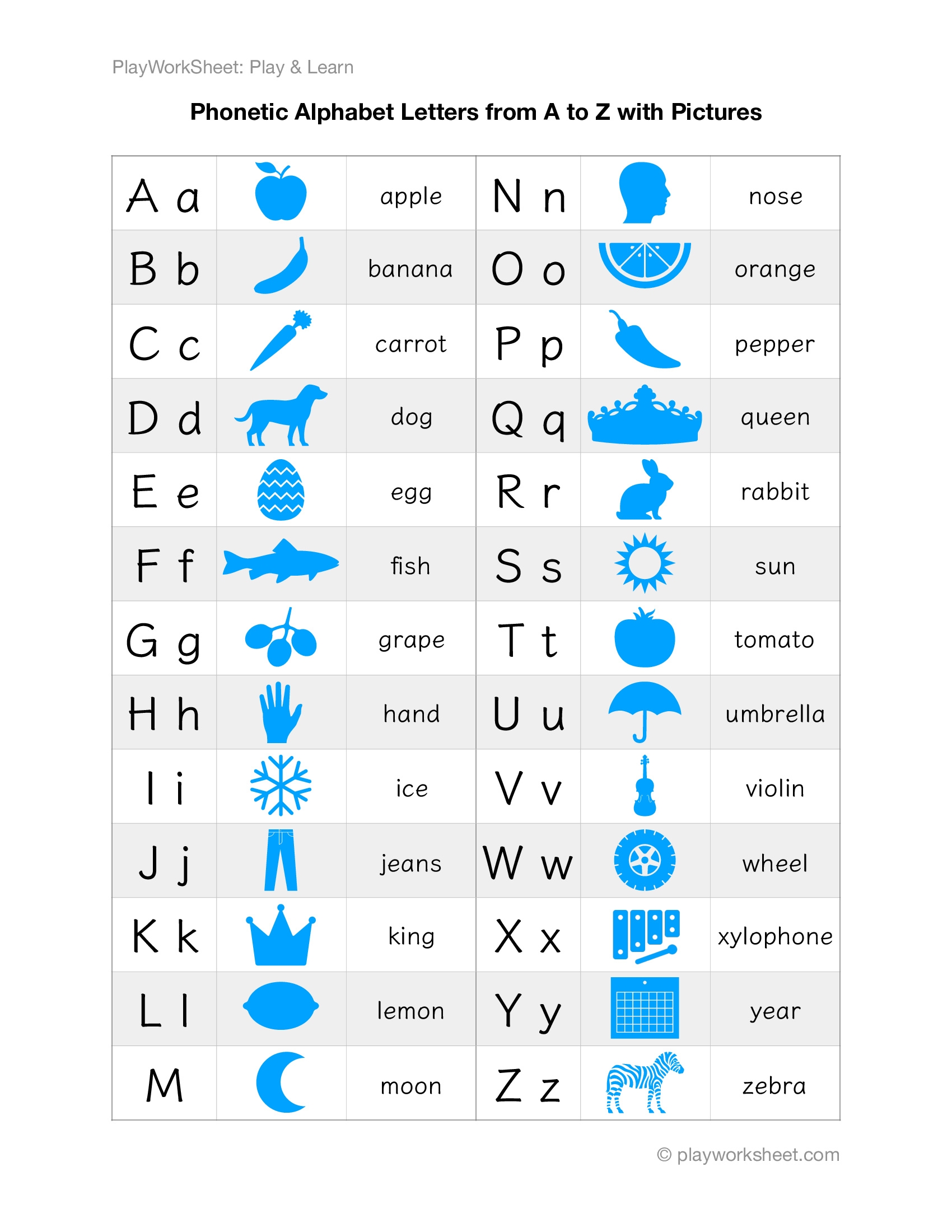 Phonetic Alphabet Letters From A To Z With Words In Cartoon Pictures Free Printables For Kids