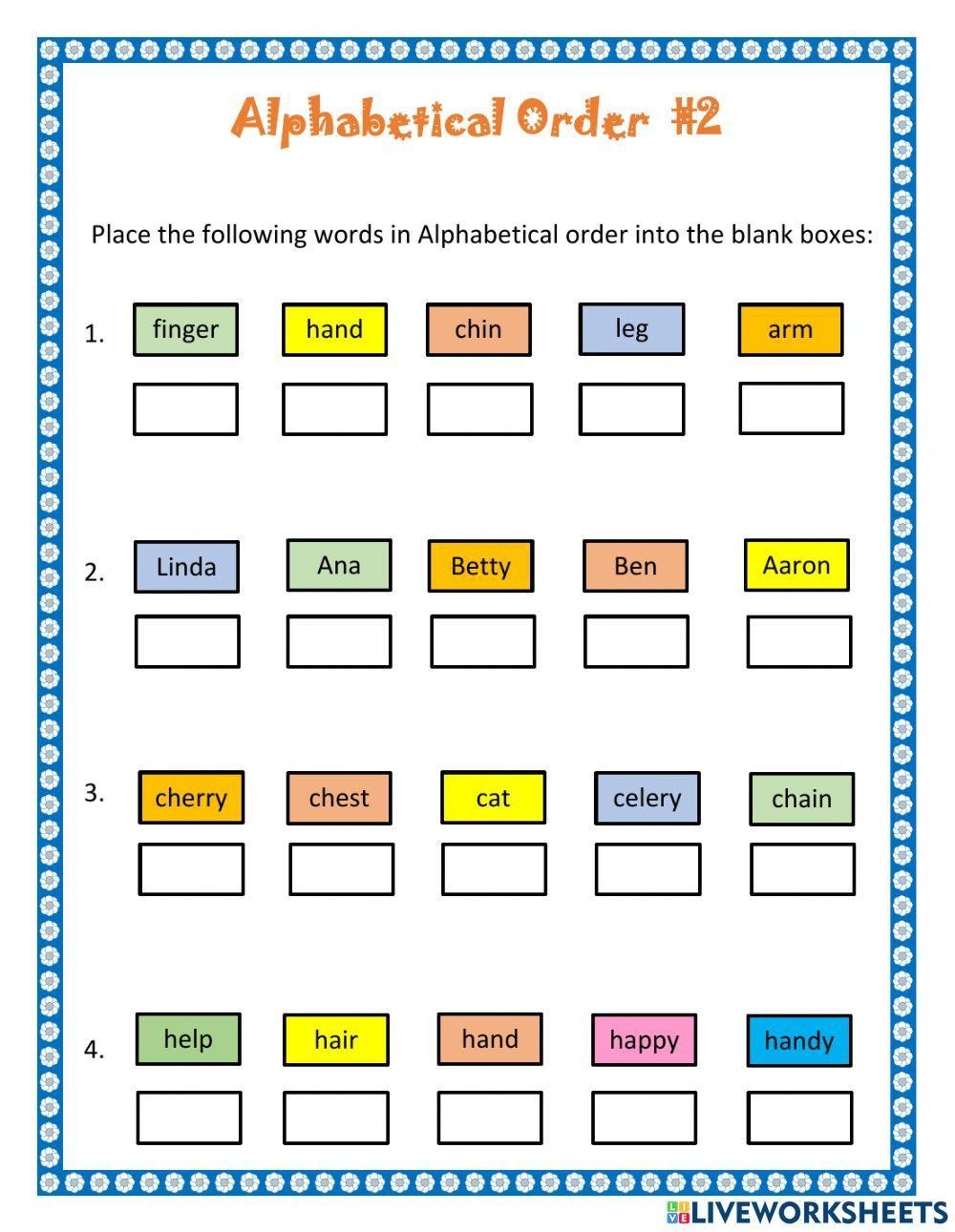 With alphabetical order second letter worksheets, kids can work on their sequencing skills while having a blast. These worksheets are perfect for parents and teachers looking to reinforce the alphabet in a creative way. Children will enjoy the challenge of figuring out the correct order of letters in a word.