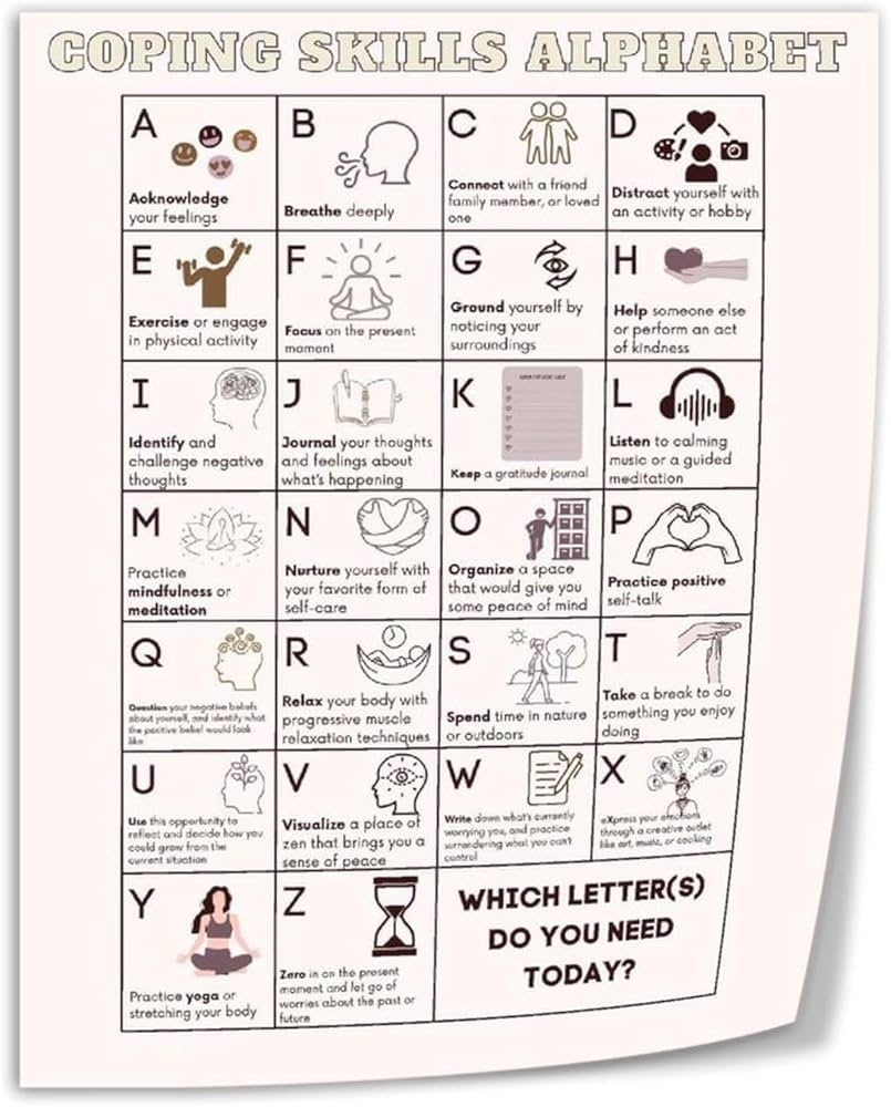 Start by brainstorming coping strategies that start with each letter of the alphabet. For example, A could be for “Take deep breaths,” B could be for “Go for a walk,” and so on. Get creative and think of unique ways to cope with stress and difficult emotions.