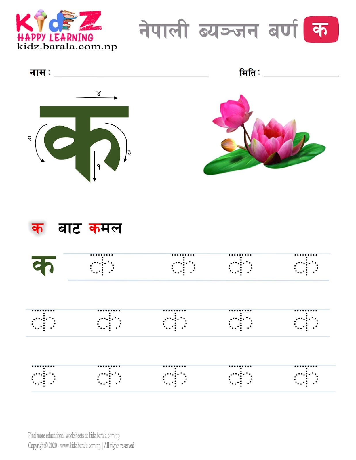 Nepali Consonant Letter KA For Kindergarten With Tracing Image And Worksheets