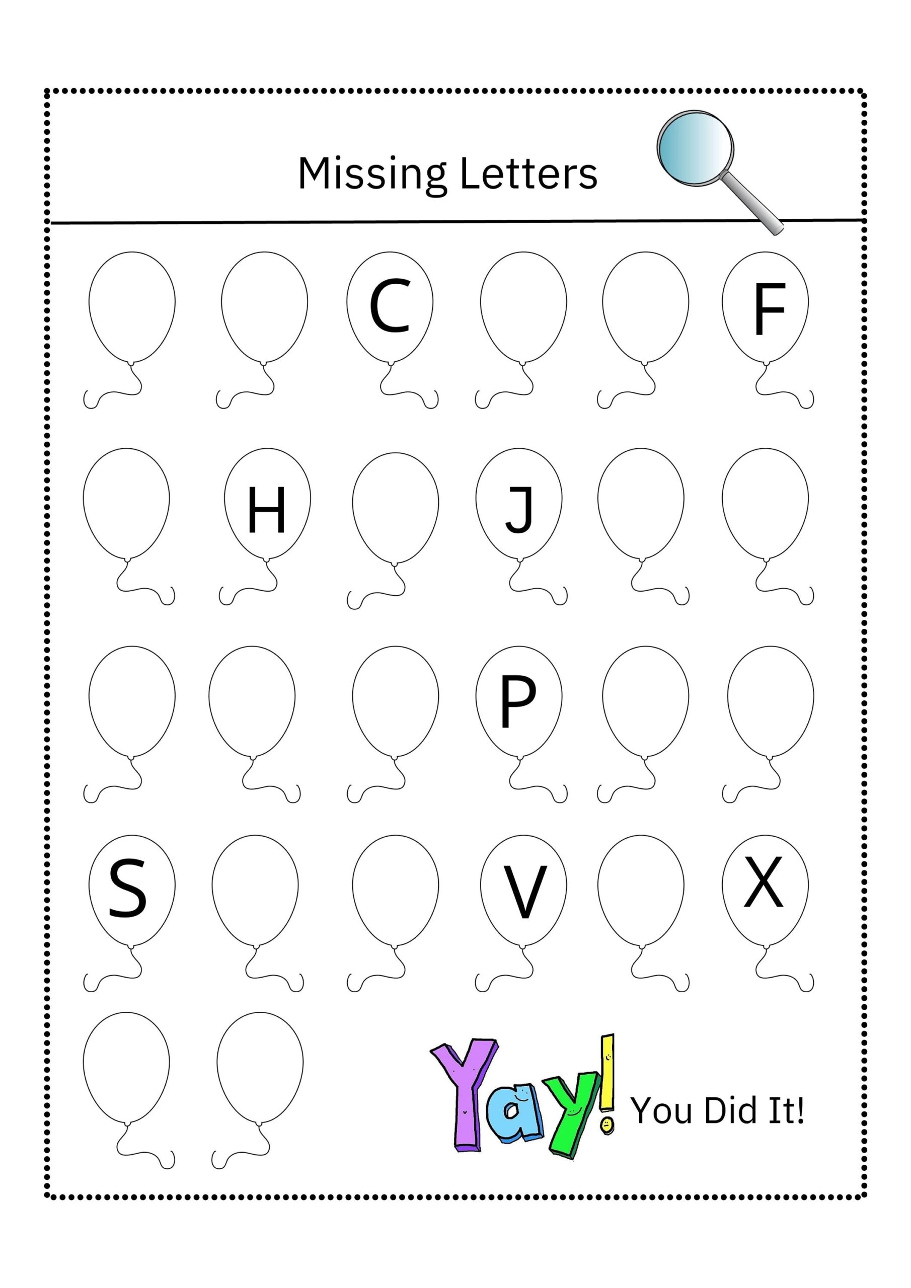 This worksheet provides a hands-on approach to learning the alphabet by allowing children to fill in the missing letters. It’s a great way to reinforce letter recognition and sequencing skills in a playful manner.
